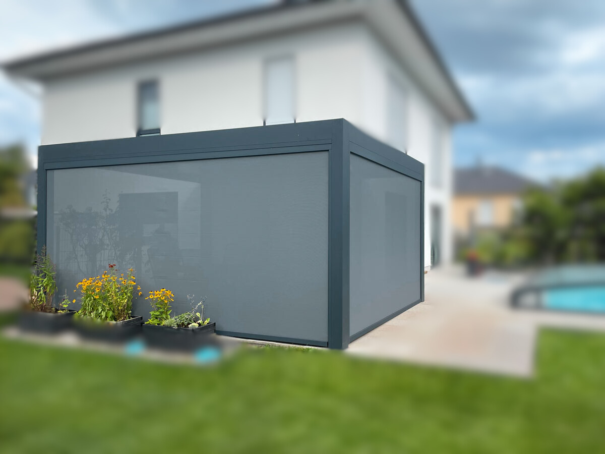 Unsere elektrischen Zip Screens aus hochwertigem Stoff Serge 600 schützen vor Sonne und Wind und bieten zusätzlichen Komfort auf Knopfdruck.