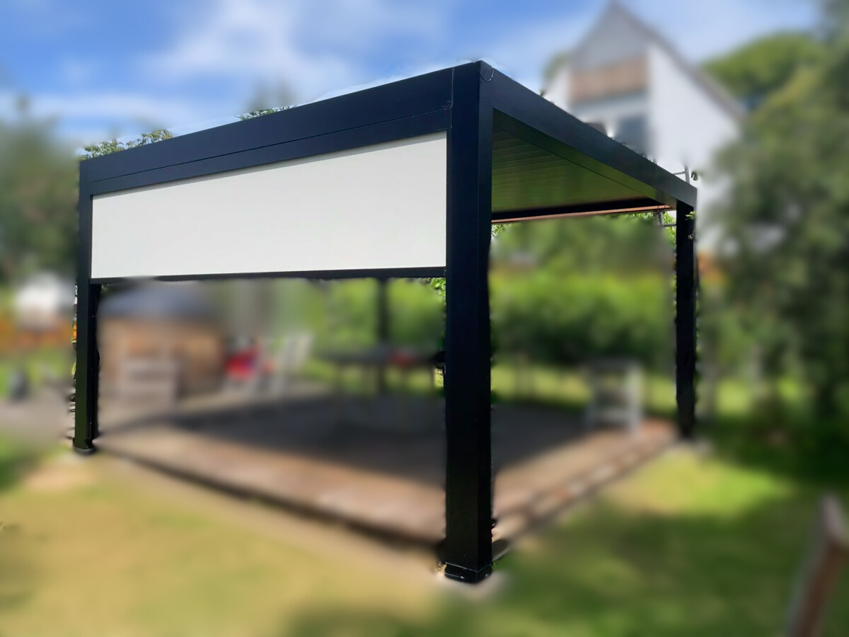 Entdecken Sie unsere Lamellendach-Pergola mit hochwertiger UV-beständiger Pulverbeschichtung in drei ansprechenden Finishes: Matt Glatt, Sandpapierstruktur und Holzoptik. Gestell- und Lamellenfarben können individuell kombiniert werden, um Ihren persönlichen Stil zu unterstreichen.